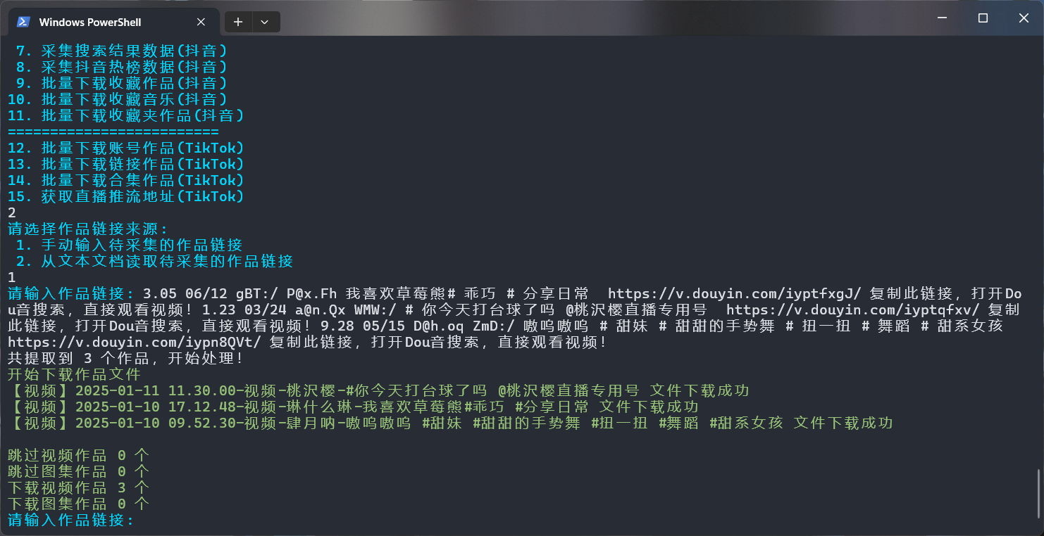 返回程序界面,依次选择 终端交互模式 -> 批量下载链接作品(通用) -> 手动输入待采集的作品链接